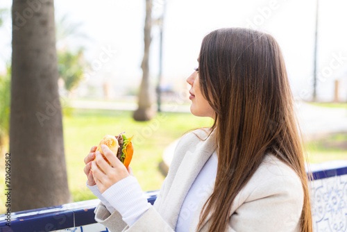 cheeseburger, unhealthy, american, delicious, beef, food, meal, hamburger, burger, meat, girl, woman, people, person, female, woman, attractive, pretty, young, adult, brunette, background, hispanic, caucasian, exterior, outside, back, position, pose, racked