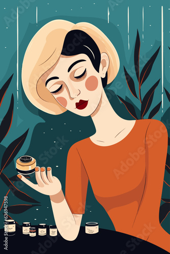 client, product, choose, pecking, shopping, cosmetic, make-up, woman, store, shop, salesperson, home, young, pretty, lady, buy, cream, jar, decide, decision, care, beauty, skin, thinking, pensive, sample, thoughtful, sell, attractive, face, hand, counter, girl, beautiful, female, shopper, buyer, salon, retail, person, promote, recommend, offer, green, caucasian, illustration, vector, editable