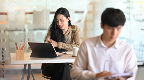Young professional female designer working on her project while tablet with co-worker in the background.