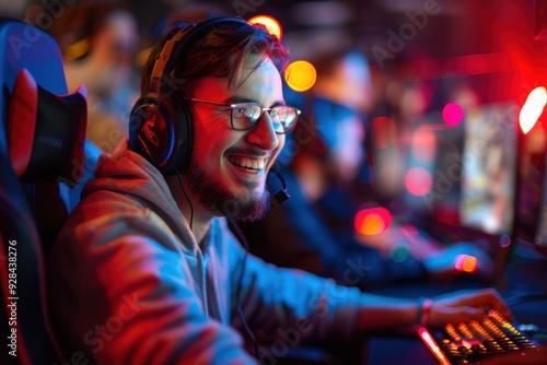 gamer, streamer, game, webcam, male, professional, keyboard, computer, team, earphones, championship, smiling, technology, man, blue, red, neon, fun, online, teenage, entertainment, gaming, player, competition, broadcasting, display, follower, gameplay, monitor, play, tournament, video game