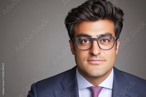Young professional man in dark suit and glasses looking seriously into the camera symbolizing intelligence corporate ambition and strategy