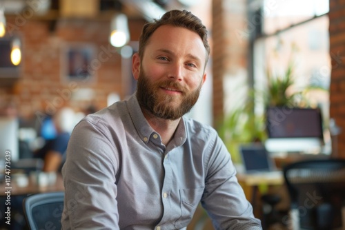 technology, adult, man, eye, business, businessman, professional, men at work, smiling, background, office, young, camera, portrait, desk, field, computer, indoor, 1, blurred, success, looking, happy, day, confident, caucasian, person, friendly, employee, team, entrepreneur, corporate, startup, workplace, casual attire, cheerful, positive, optimistic, copy, shirt, approachable, male, depth, contact, leader, motivated, ambitious, determined, co-worker