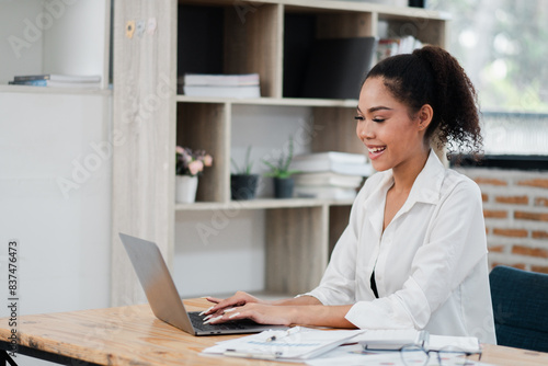woman, professional, laptop, office, modern, desk, working, smiling, business, technology, computer, workspace, corporate, young, female, entrepreneur, casual attire, contemporary, indoor, job, occupation, typing, cyberspace, communication, career, employee, workplace, person, lifestyle, happy, productivity, success, confident, cheerful, digital, freelance, remote, home, interior, design, creative, project, planning, organisation, sharpened, concentration, education, learning