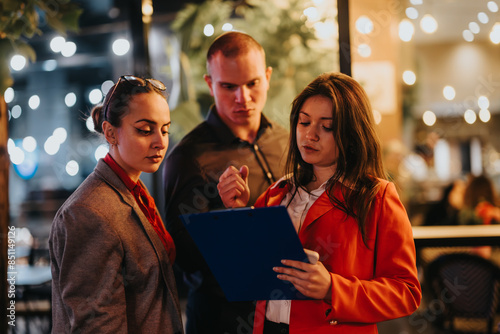 Young professionals engaged in an outdoor business meeting, discussing project details and brainstorming ideas in a vibrant and illuminated environment.