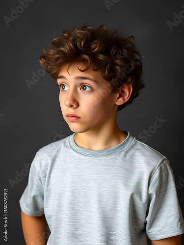 Young puzzled man with curly hair posing and looking aside