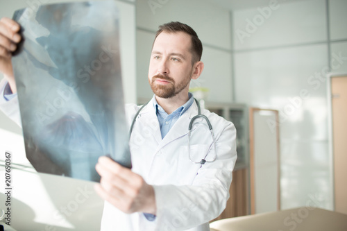 Young radiologist in uniform looking at x-ray image before making medical diagnosis