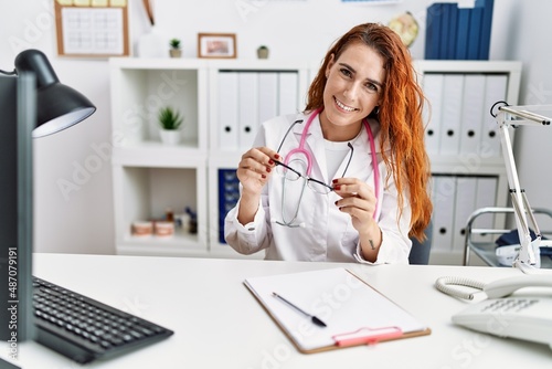 Young redhead woman wearing doctor uniform holding glasses at hospital