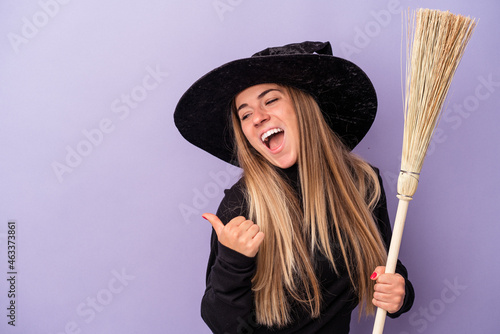 Young Russian woman disguised as a witch holding a broom isolated on purple background points with thumb finger away, laughing and carefree.
