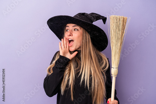 Young Russian woman disguised as a witch holding a broom isolated on purple background shouting and holding palm near opened mouth.