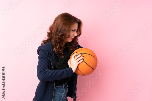 girl, woman, woman, people, person, female, studio, youth, young, adult, caucasian, brunette, russian, background, wall, isolated, pink, colourful, basketball, player, ball, sport, playing, holding, athlete, standing, practicing, healthy, lifestyle, sport, professional, training, exercise, game, leisure, hobby