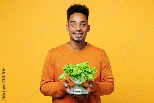 Young sad disappointed man wear orange sweatshirt casual clothes hold lettuce salad on scales isolated on plain yellow background studio. Proper nutrition healthy fast food unhealthy choice concept.