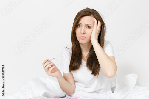 Young sick tired sad woman in pajamas sitting on bed, holding clinical thermometer with high fever temperature isolated on white background. Female feeling bad, spending time at home. Advertising area