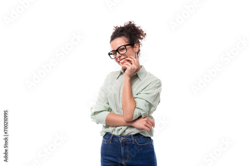 young slender brunette assistant woman in glasses dressed in a shirt and jeans