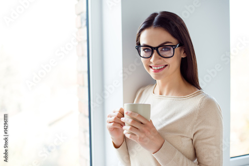 Young smart successful smiling woman in glasses having break, holding cup and drink coffe while standing near window.