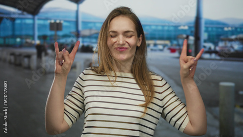 Young smiling caucasian woman in striped shirt raises both hands in rock horns gesture at airport terminal; excitement.
