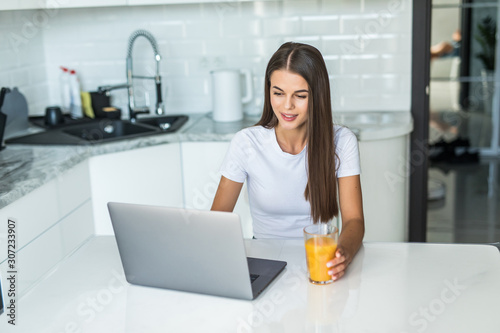 Young smiling woman having breakfast in the kitchen connecting with a laptop and drinking an healthy orange juice