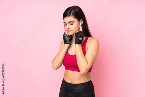 Young sport woman over isolated pink background listening music