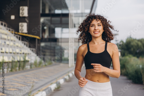 Young sportswoman running near stadium bleachers