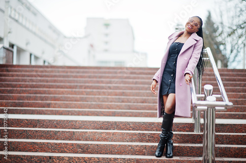 Young stylish beautiful african american woman in street against stairs, wearing fashion outfit coat, eyeaglasses.