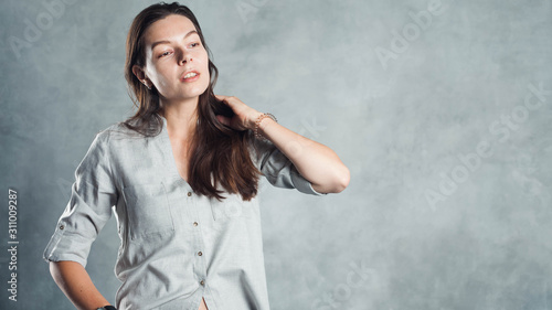confident, calm, business, young, woman, girl, portrait, grey, casual attire, wall, simple, stylish, brunette, female, modern, shirt, lifestyle, trendy, satisfaction, manager, human, working, ceo, businesswoman, positivity, smile, professional, occupation, face, people, 1, looking, person, beautiful, space, caucasian, confidence, cheerful, smiling