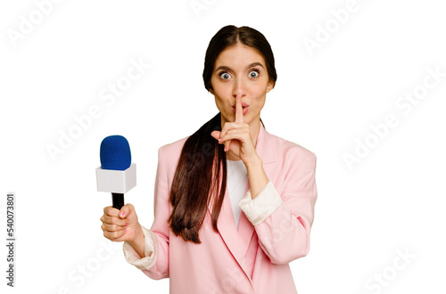 Young TV presenter caucasian woman isolated keeping a secret or asking for silence.