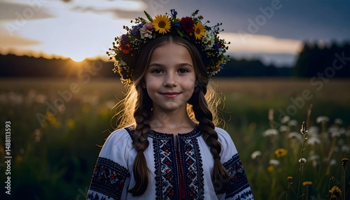 realistic, portrait, ukraine, culture, slavic, meadow, peaceful, heritage, beauty, flower, summer, nature, children, face, spring, flower, chaplet, hair, smile, fashion, grass, green, outdoors, person, model, people, happiness, childhood, garland, smiling, field, joy