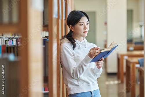 Young variously facial expression female college student model looking for and reading a book on a shelf in a university library in Asia South Korea
