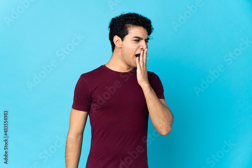 Young Venezuelan man isolated on blue background yawning and covering wide open mouth with hand