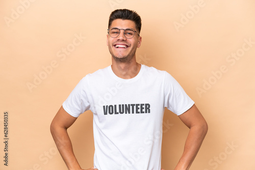 Young volunteer caucasian man isolated on beige background posing with arms at hip and smiling