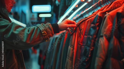 Young white woman choosing and buying new clothes for her. Two red polished hands on the clothes