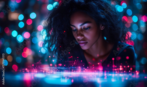 woman, digital, hologram, futuristic, technology, neon, glowing, datum, interface, bokeh, dark, tech, analysis, cyber, high technology, modern, innovation, science, artificial intelligence, ai, programming, coding, software, virtual, visualisation, digital display, network, electronic, creative, thinking, sharpened, concentration, screen, computer, communication, female, portrait, digital artwork