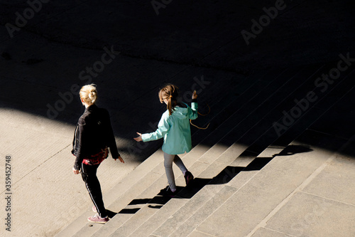 mother, daughter, human relationships, trust, hand, young, touch, contact, identity, woman, girl, stair, staircase, public, staircase, step, shadow, shade, going, walking, down, eltern, single, care, connection, safety, safe, life, sunny, together, schoolgirl, holding, influence, street, city, pedestrian, toy, family, bond, unrecognizable, reaching, attachment, back, rear, behind, blond, children, adult