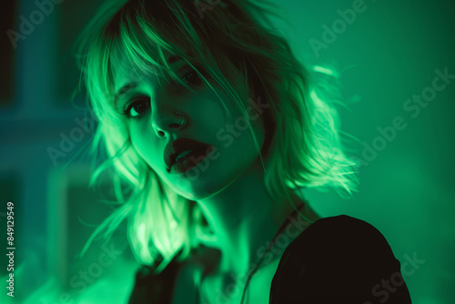 Young woman around 20 years old, wearing makeup with bold lipstick, under green lighting, dressed in a black blouse, with a questioning expression
