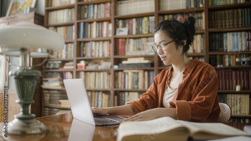 diligent, young, woman, student, focused, library, laptop, computer, freelancer, work, poet, project, writer, article, report, korean, vietnamese, happy, cheerful, positive, success, writing, notebook, note, wi-fi, distant, school, studying, desk, education, female, cognition, read, study, college, sitting, university, research, learning, bookcase, book, reading, information, indoor, literature, public, cyberspace, homework