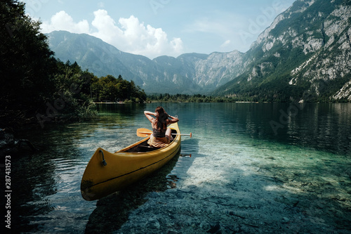 Young woman canoeing in the lake bohinj on a summer day, background alps mountains.