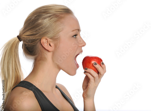 woman, young, beautiful, eating, biting, apple, fruit, diet, nourishment, fresh, organic, people, food, healthy, red, blond, dieting, female, portrait, holding, 1, produce, wellness, studio, white, caucasian, profile