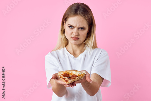 pizza, woman, food, girl, happy, ravenous, eating, isolated, people, model, face, woman, eat, background, white, blue, slice, pink, table, beautiful, sexy, deliciously, sexual, delicious, bright, advertisement, studio, young, female, caucasian, smile, fast, attractive, sensual, pretty, yellow, beauty, adult, 1, healthy, lady, shirt, snack, portrait, short, holding, glamour, fat, breakfast, mouth