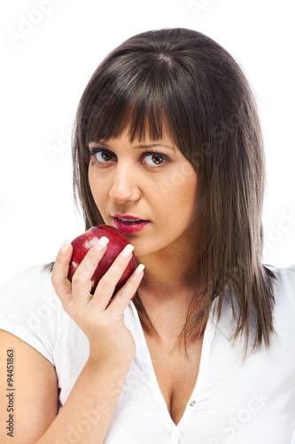young, woman, red, eating, apple, isolated, white, face, female, missy, hand, woman, bright, breakfast, healthy eating, healthy, health food, high key, high key, red apple, fruit, food, vegetable, american, cookery, us, isolated on white, white background, looking, lip, vegetarian