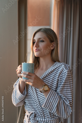 bathrobe, home, luxury, family, young, happy, lifestyle, window, people, hot drink, living, looking, romantic, indoor, house, interior, love, room, person, beautiful, adult, portrait, romance, standing, smile, female, joy, alone, leisure, cheerful, enjoying, evening, woman, girl, sunset, wife, cup, real, estate, drinking, affectionate, lover, hugging, modern, relax, relaxing, landscape, city