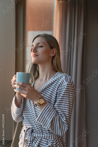 bathrobe, home, luxury, family, young, happy, lifestyle, window, people, hot drink, living, looking, romantic, indoor, house, interior, love, room, person, beautiful, adult, portrait, romance, standing, smile, female, joy, alone, leisure, cheerful, enjoying, evening, woman, girl, sunset, wife, cup, real, estate, drinking, affectionate, lover, hugging, modern, relax, relaxing, landscape, city