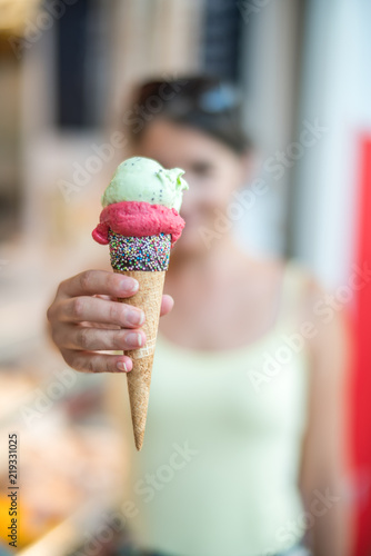 woman, young, ice, ice cream, break, sweet, people, hand, body, girl, dessert, pause, relax, summer, indoor, enjoy, coloured, cone, holiday