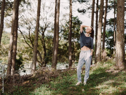 Young woman enjoying nature in a forest, dressed in casual gray sweatpants and a cropped top, exuding a carefree attitude amidst tall trees and greenery