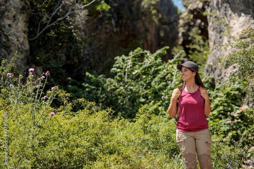 Young woman enjoying nature.Hiking in the mountains, observing the landscape.Doing sports and physical activity.Let's take care of our natural surroundings and our environment.Moments of disconnection