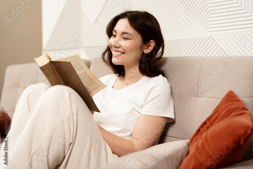 relaxing, female, woman, reading, book, home, comfortable, sofa, leisure, living room, smile, smiling, casual attire, happy, happiness, indoor, young adult, novel, education, literature, relaxed, enjoying, serene, sitting, calm, white shirt, recreation, lifestyle, cosy, peaceful, interior, apartment, daylight, one person, person, people