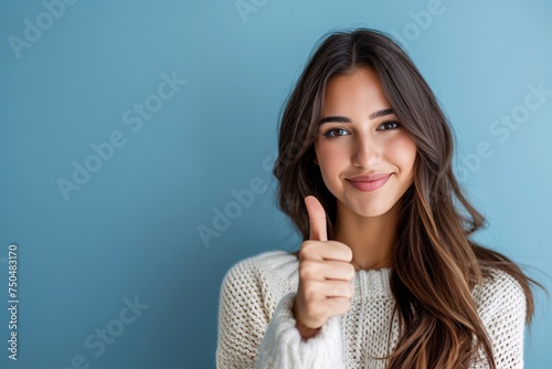 Young Woman Giving Thumbs Up Against Blue Background. Generative AI