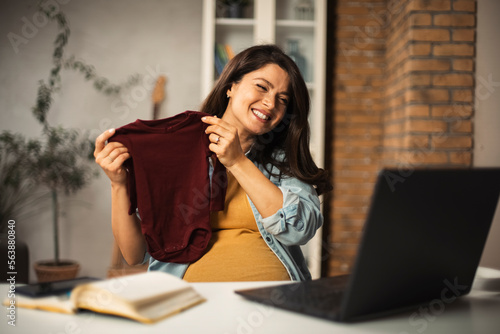 Young woman having video call. Beautiful pregnant woman showing baby clothes.