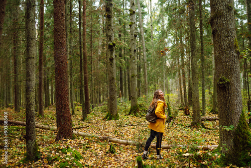 Young woman hiking in a pine wood. Active lifestyle. People in autumn forest. Nature, travel, rest concept