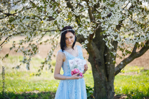 Young woman in a blue long dress holds a wedding glider in her hands