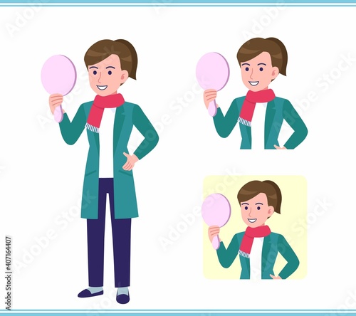 character, simple, vector, set, upper body, young, kind, woman, girl, missy, winter clothes, coat, green, muffler, student, college students, mirror, hand mirror, make-up, health, health care, prevention, disease, hospital, smile, point, precaution