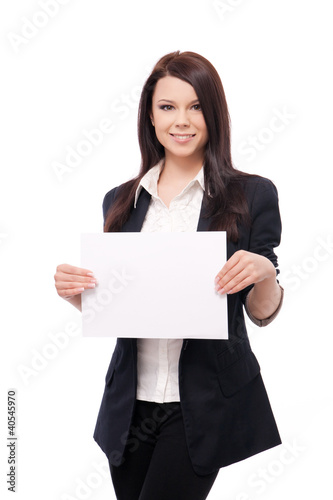 girl, blouse, coat, white, isolated, woman, people, person, long hair, business, adult, student, young, suit, black, beautiful, corporate, office, face, portrait, model, brunette, education, sheet, plate, show, present, happy, smiling, joyful, attractive, rally, discount